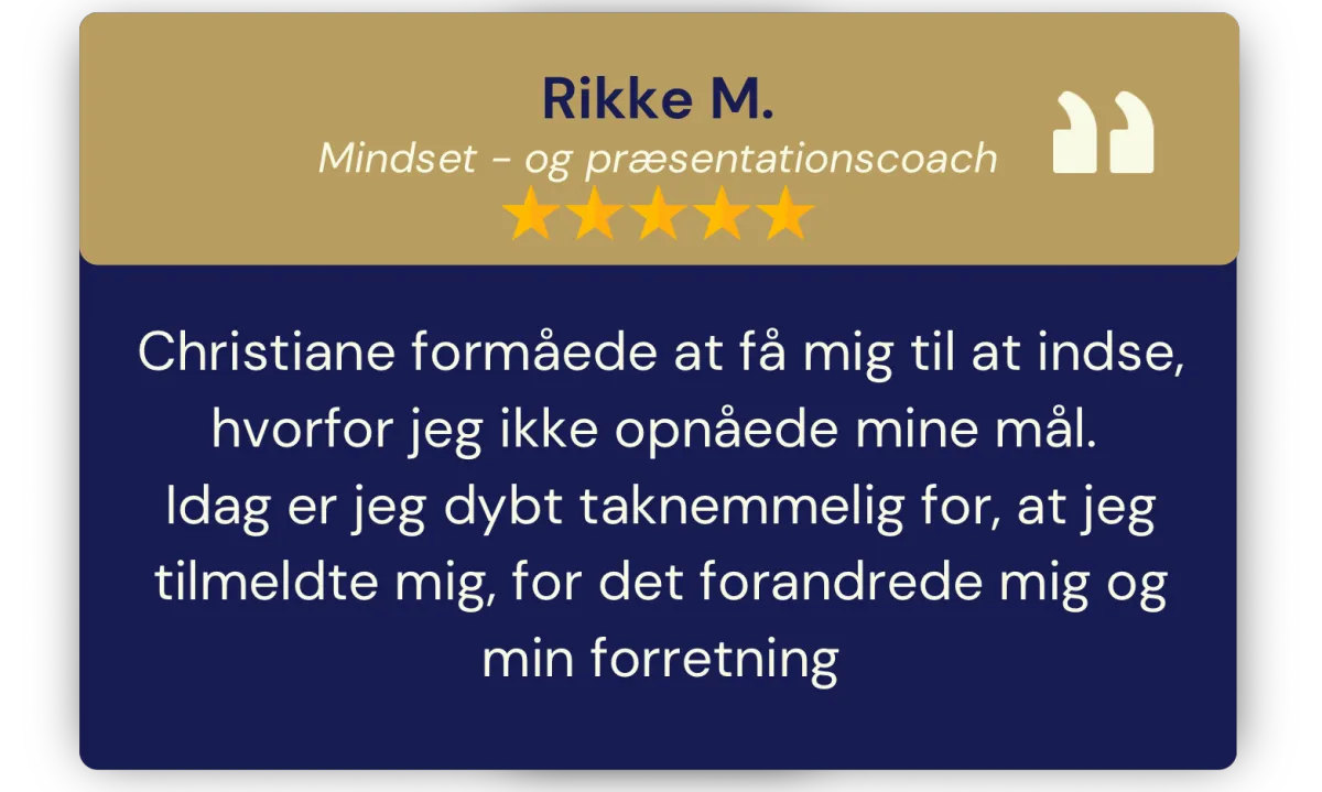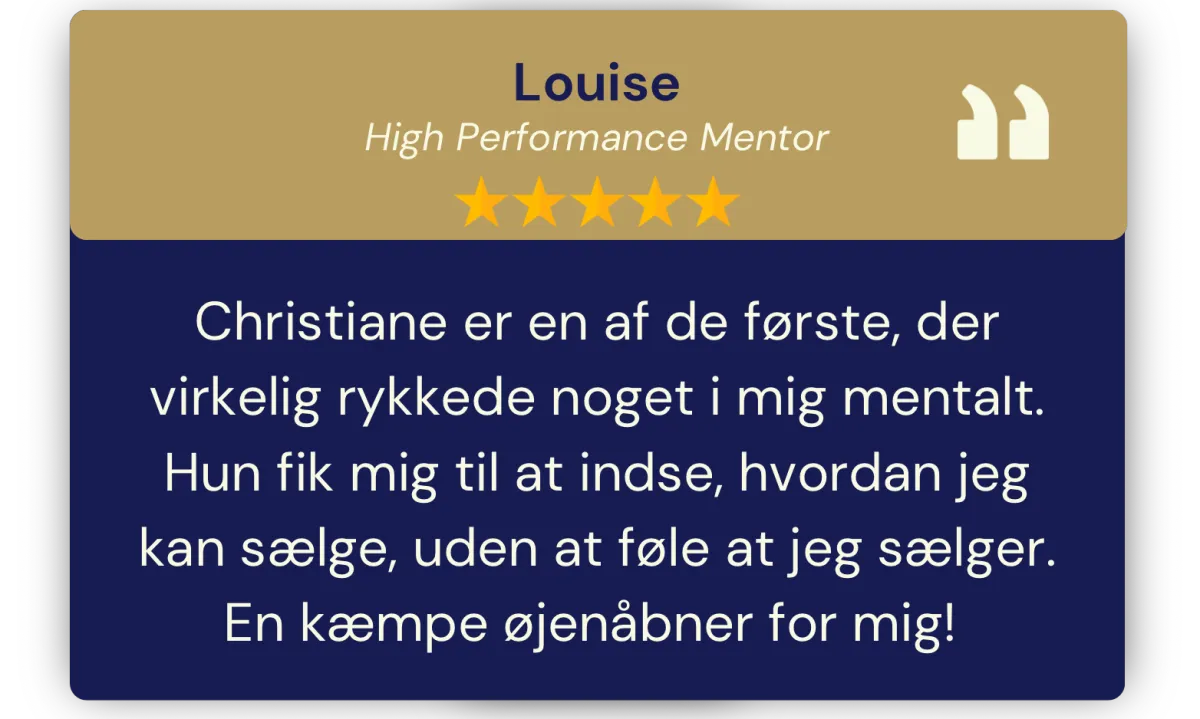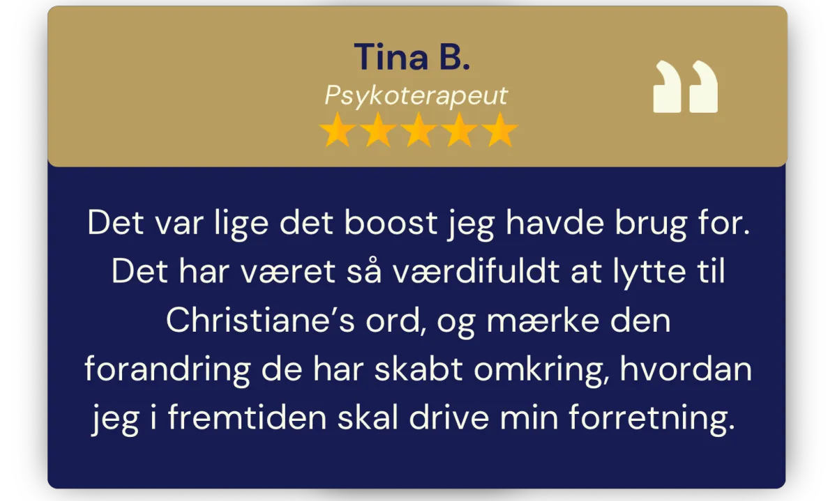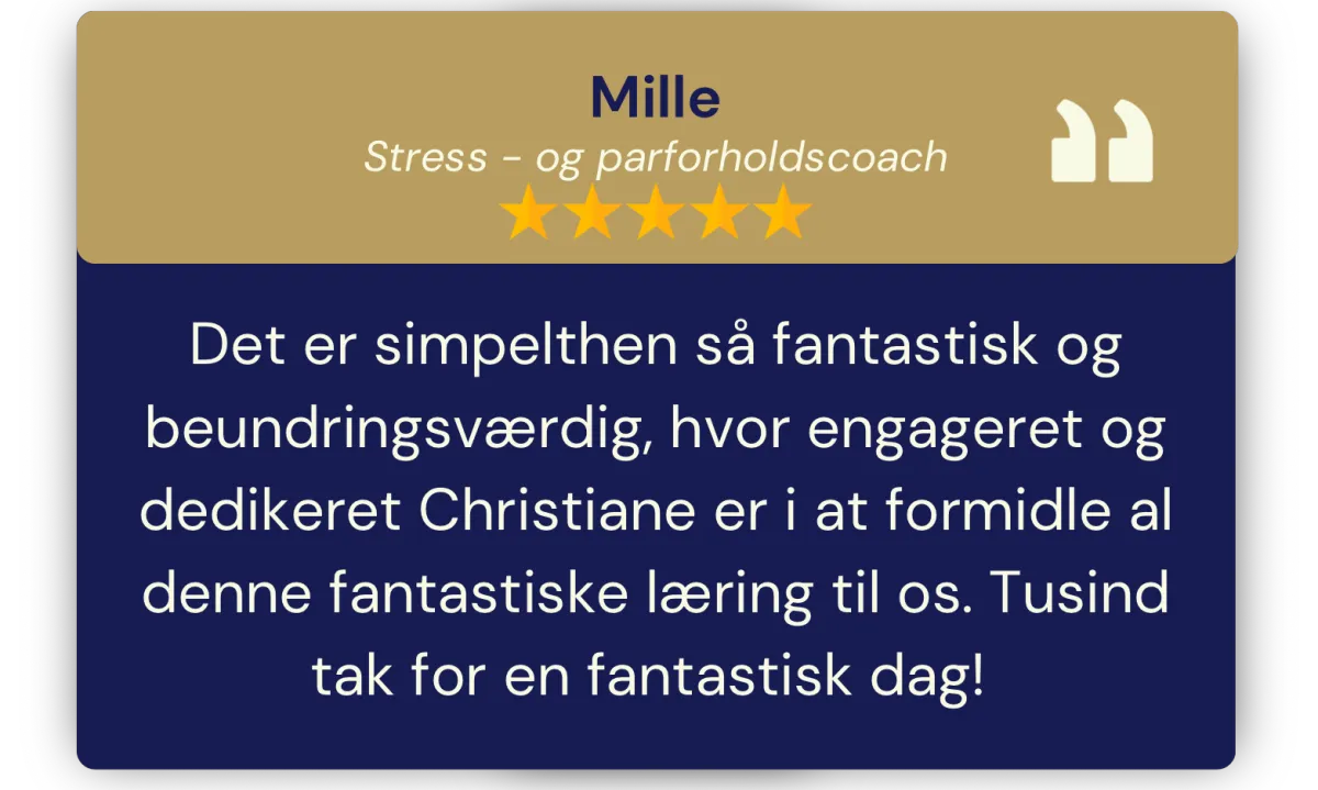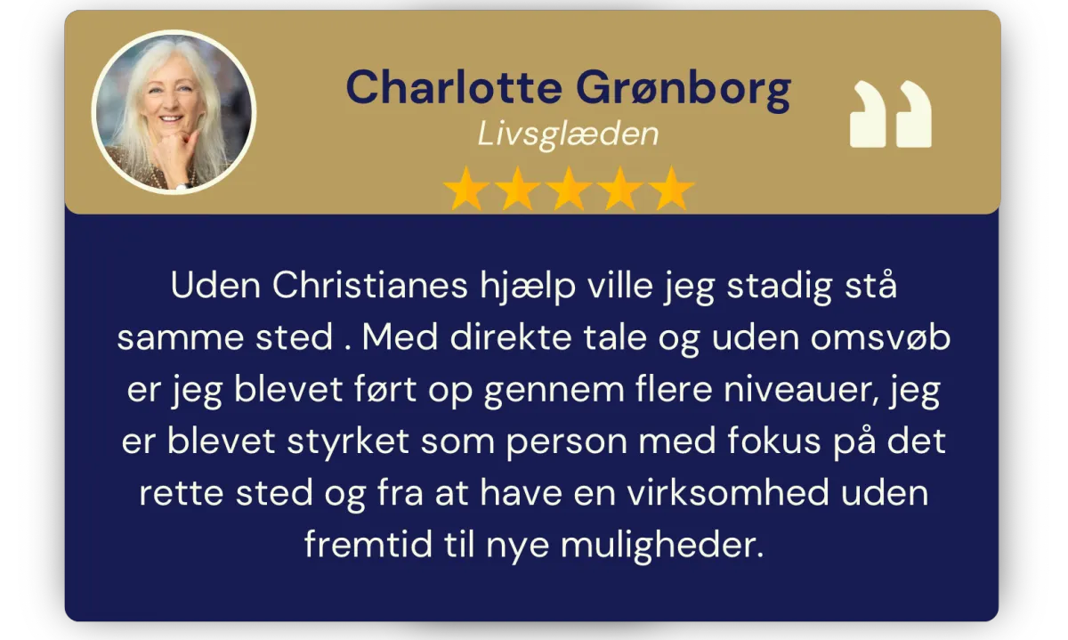 Christiane Meulengracht underviser med sine mere end 20 års erfaring. Hun har startet 3 succesfulde virksomheder der hurtigt omsatte for et 7-cifret beløb årligt. Hun samarbejder blandt andet med Coloplast, Novo Nordisk, Danske Bank, Region Hovedstaden m.fl., hvor hun deler ud af sin ekspertise.